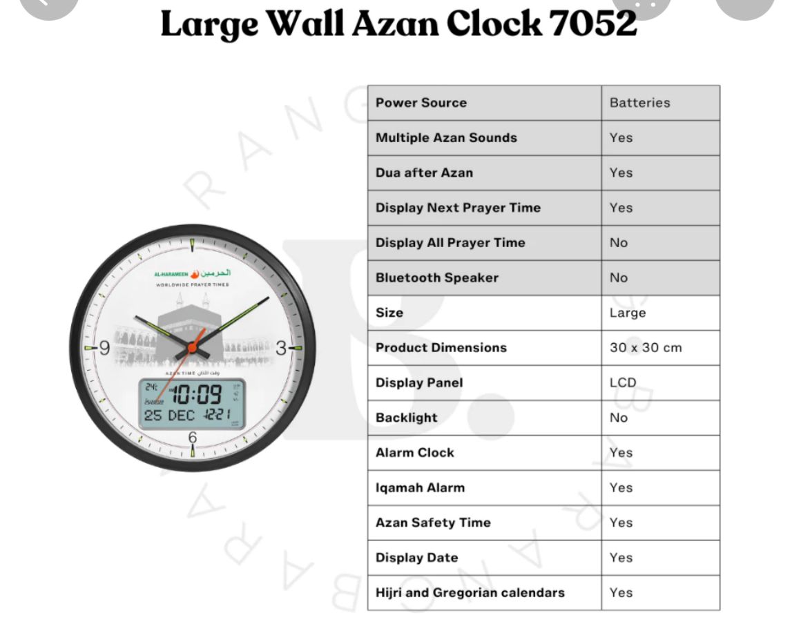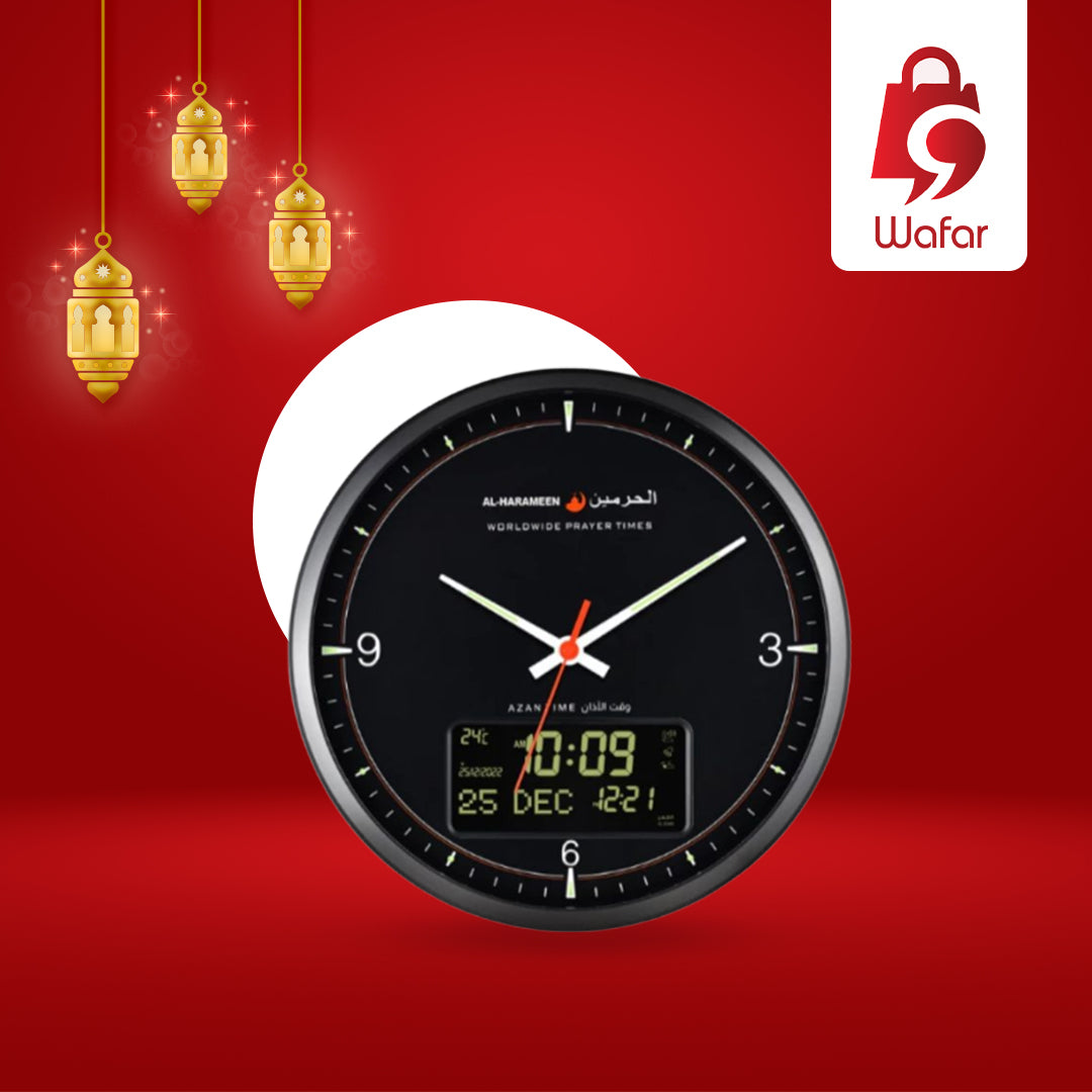 ساعة متعددة الوظائف وغنية بالمزايا، مناسبة للمسلمين من جميع أنحاء العالم. تجمع بين واجهة ساعة تناظرية تقليدية وشاشة رقمية تعرض مواقيت الصلاة لأكثر من 6000 مدينة حول العالم. كما تضم مؤشراً لاتجاه القبلة، وتعرض التقويم الهجري والميلادي، بالإضافة إلى وظائف أخرى مفيدة.
