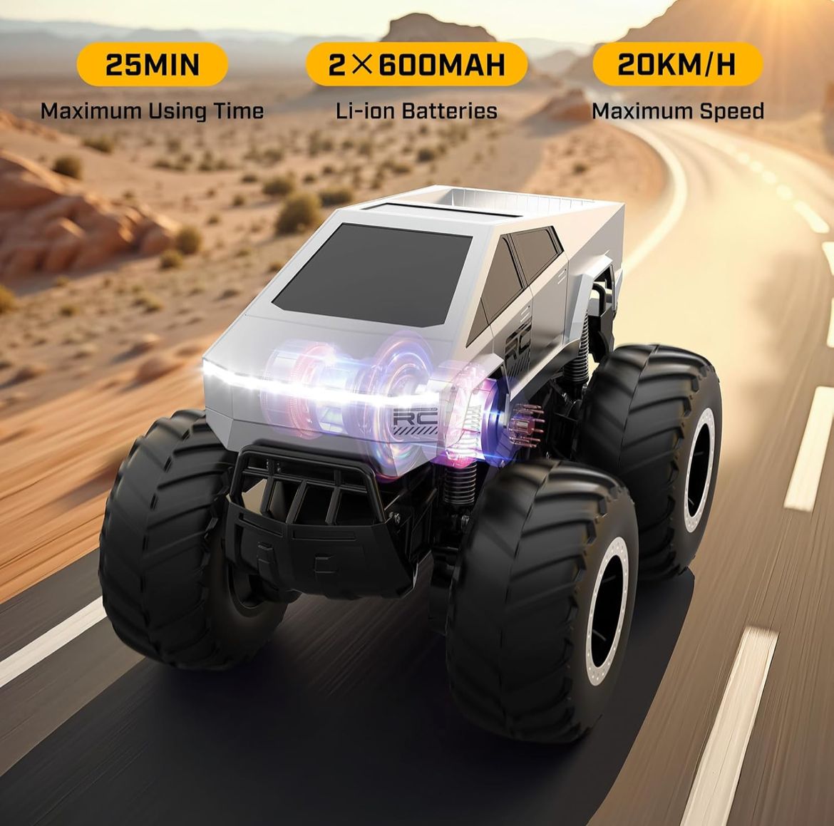 تصميم يحاكي مظهر سيارة Cybertruck بمقياس 1:16، مناسبة للعب على العشب، في الحقول، على الشاطئ أو الرمال وغيرها من التضاريس. هدية رائعة للأطفال من عمر 5 سنوات وأكثر.