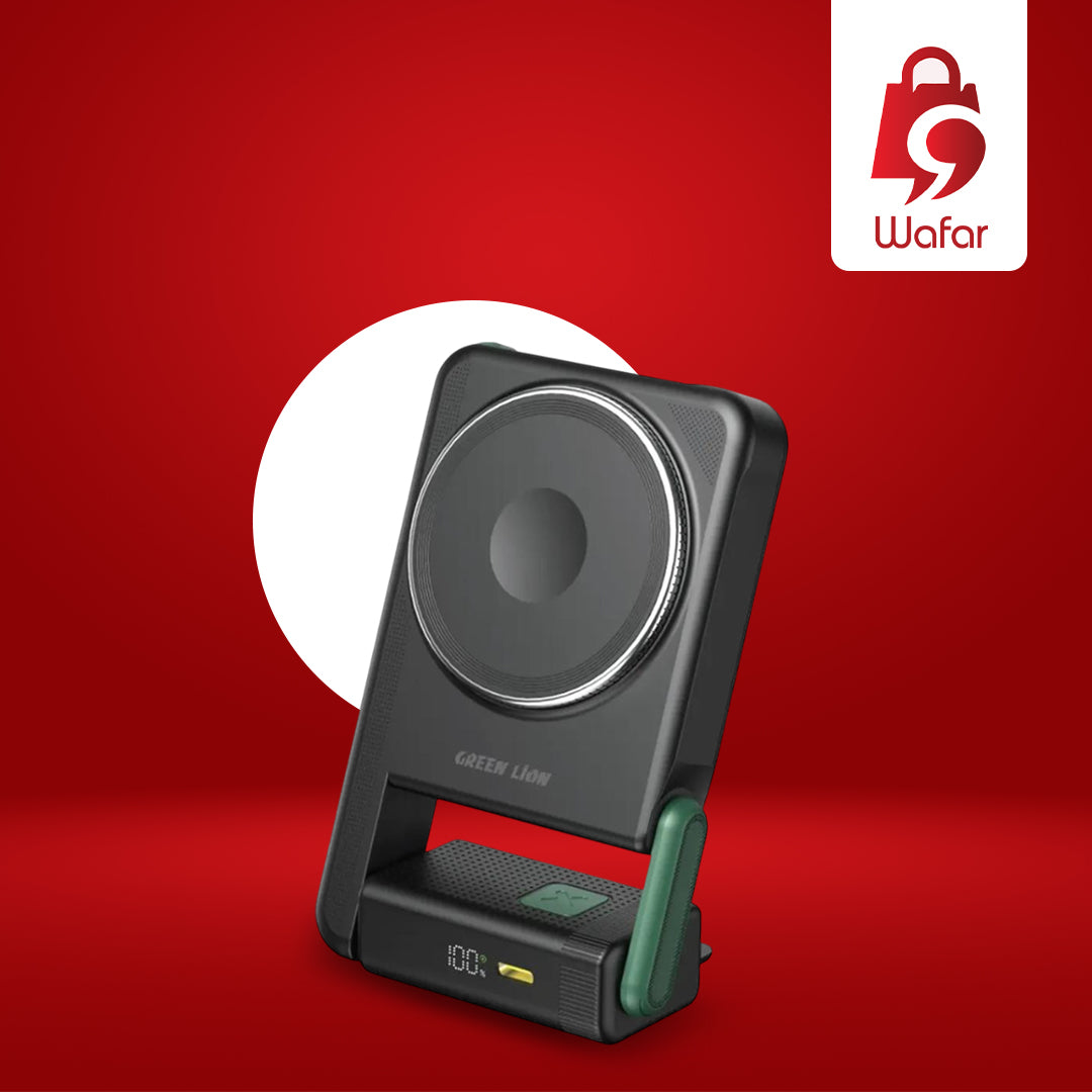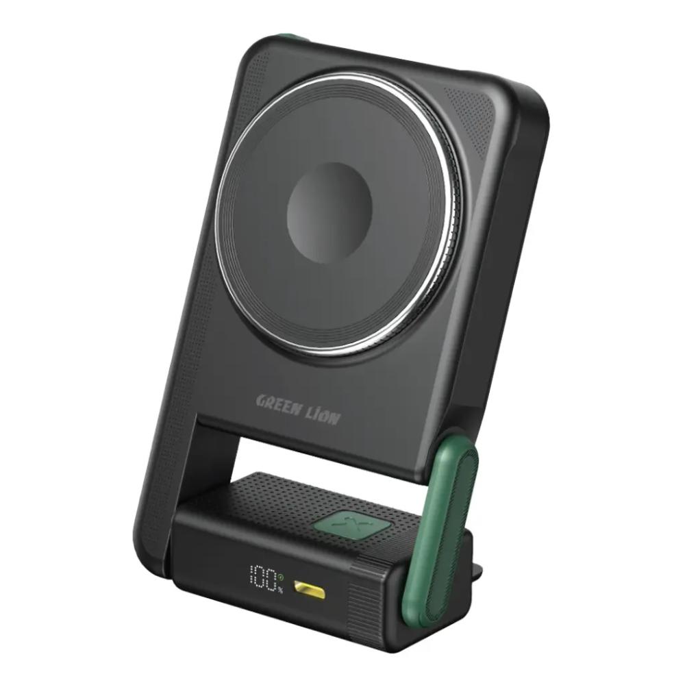 حافظ على قوتك بأناقة مع بنك الطاقة Green Lion Rotex MagSafe 10000mAh، وهو ملحق أنيق ومتعدد الاستخدامات لأداتك. تم تصميم الجهاز بحيث يتوافق مع MagSafe والشحن اللاسلكي حتى 15 وات والشحن السريع PD 22.5 وات من خلال منفذ Type-C لتحقيق الكفاءة والموثوقية. تشير الشاشة الرقمية إلى السعة المتبقية، بينما يوفر حامل دوار راحة بدون استخدام اليدين أثناء البث أو مكالمات الفيديو. تم تصميم بنك الطاقة هذا مع قاعدة شحن Apple Watch مدمجة لتلبية جميع احتياجات الشحن الخاصة بك وإبقائك على اتصال طوال اليوم. إنه صغير الحجم وقوي، وهو رفيق مثالي للعمل أو السفر أو الاستخدام اليومي.