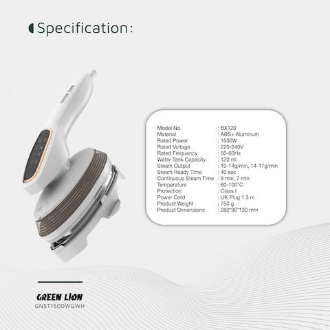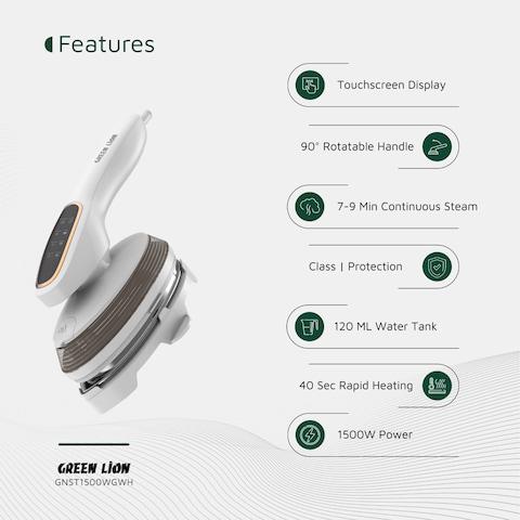 مكواة بخار جرين لاين ستيم جلايد، 1500W، 7-9 دقائق بخار مستمر، خزان مياه 120 مل، جاهز للبخار خلال 40 ثانية، مقبض دوار بزاوية 90°، شاشة تعمل باللمس، أبيض