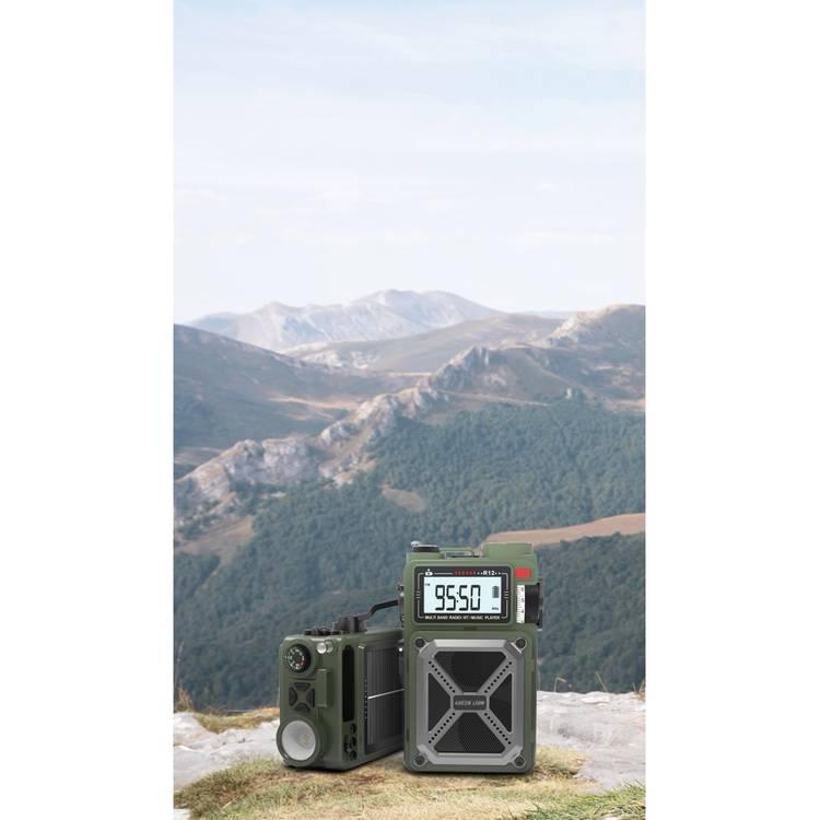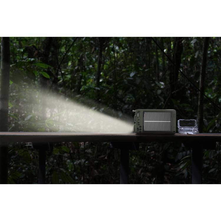 يمكن للجهاز أيضًا أن يعمل كباور بانك للطوارئ، حيث يتميز ببطارية بسعة 4000 مللي أمبير تتيح لك شحن أجهزتك عند الحاجة. كما يحتوي على شاحن يدوي (دينامو) كخيار بديل عند نفاد الشحن، بالإضافة إلى لوح طاقة شمسية لشحن الجهاز أثناء التواجد في الهواء الطلق.
