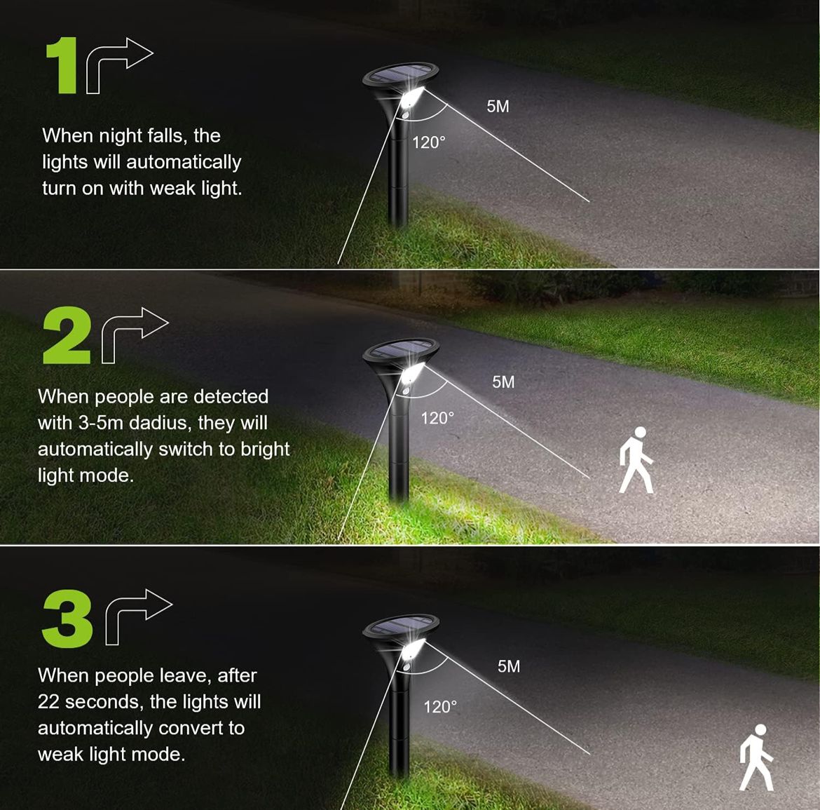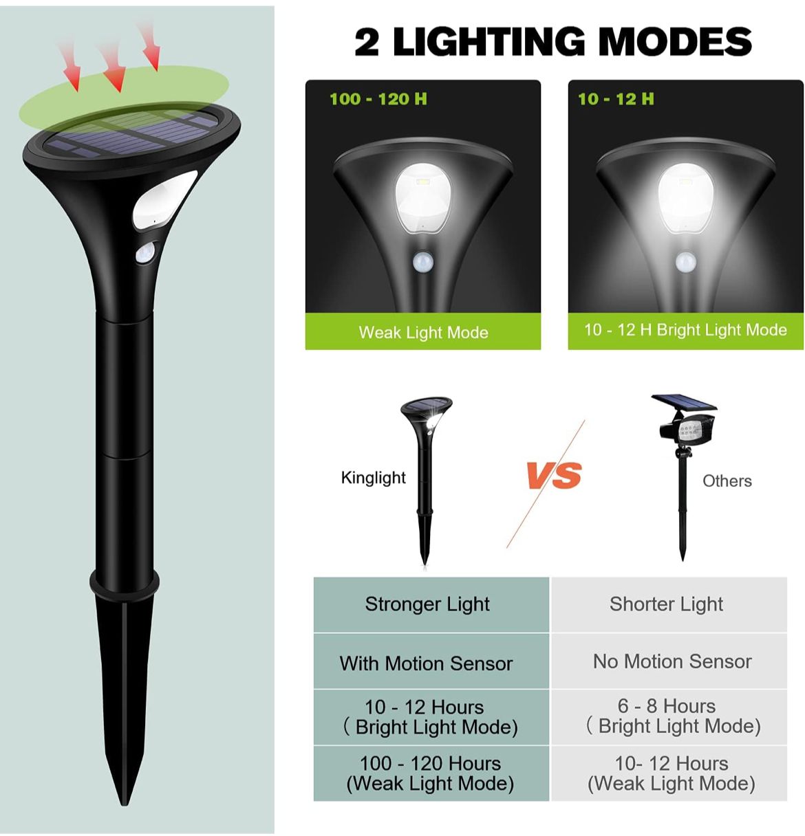 مصباح كينجلايت الشمسي للهواء الطلق، كشاف ضوء شمسي مزود بكاشف حركة، يوفر إضاءة لمدة تصل إلى 120 ساعة، مقاوم للماء بدرجة IP65، مصباح خارجي لاسلكي، وضعان للإضاءة – مثالي للحدائق، الممرات، ومداخل السيارات.
