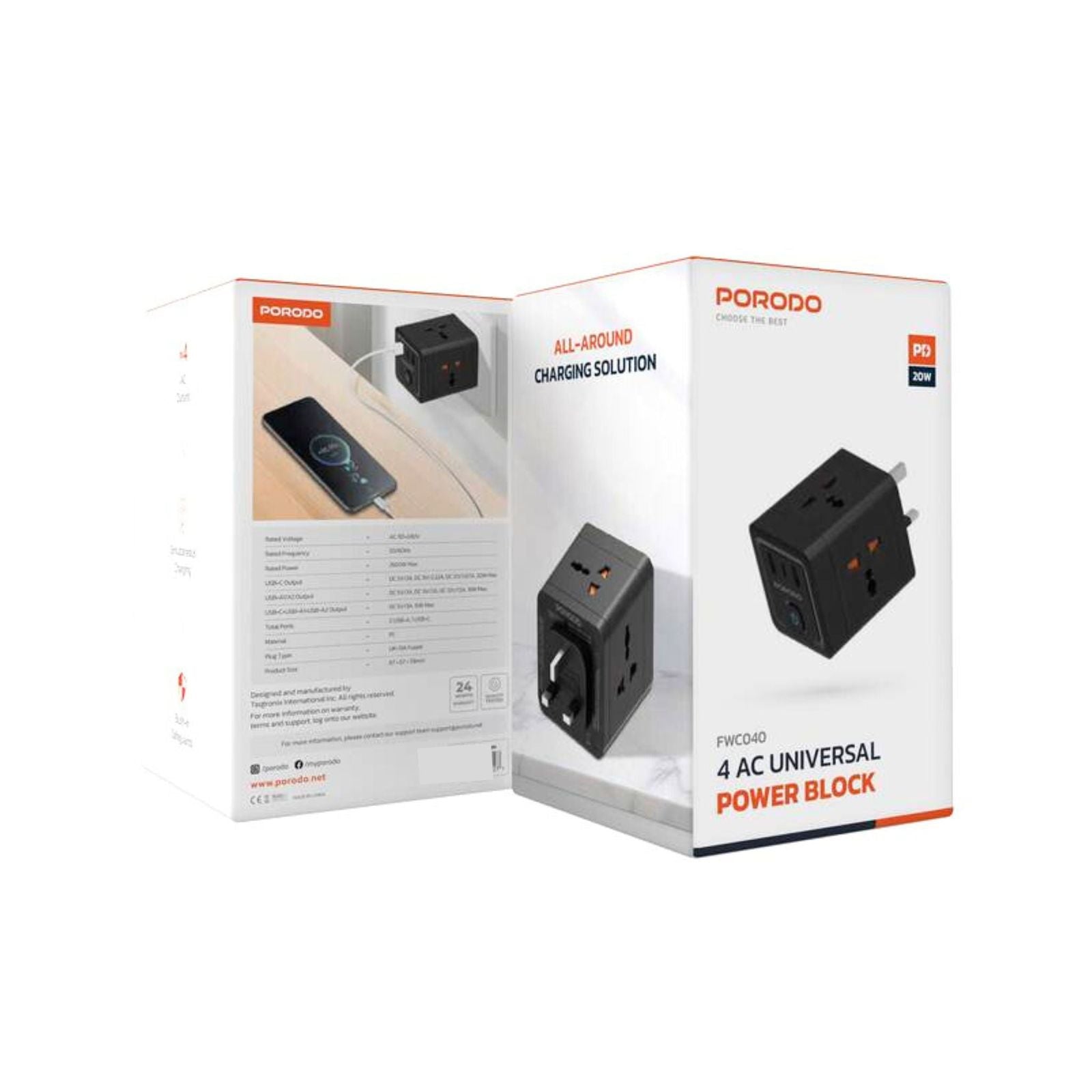 Porodo محول طاقة عالمي بـ4 منافذ AC مع منفذ USB-C ومنفذي USB-A، شحن سريع، توصيل طاقة 20 واط، حماية