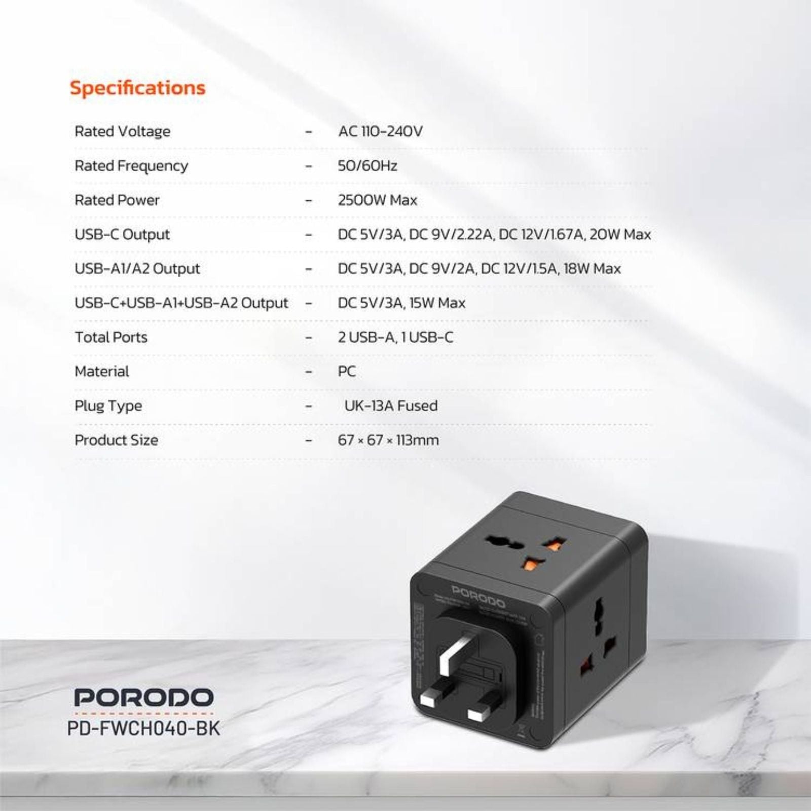 Porodo محول طاقة عالمي بـ4 منافذ AC مع منفذ USB-C ومنفذي USB-A، شحن سريع، توصيل طاقة 20 واط، حماية مدمجة، شحن متزامن، قدرة كهربائية 2500 واط - أسود
