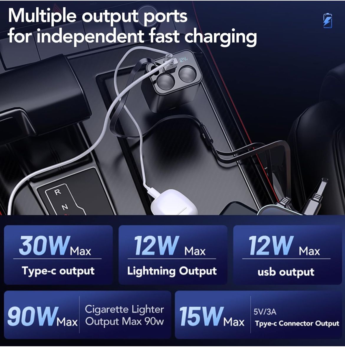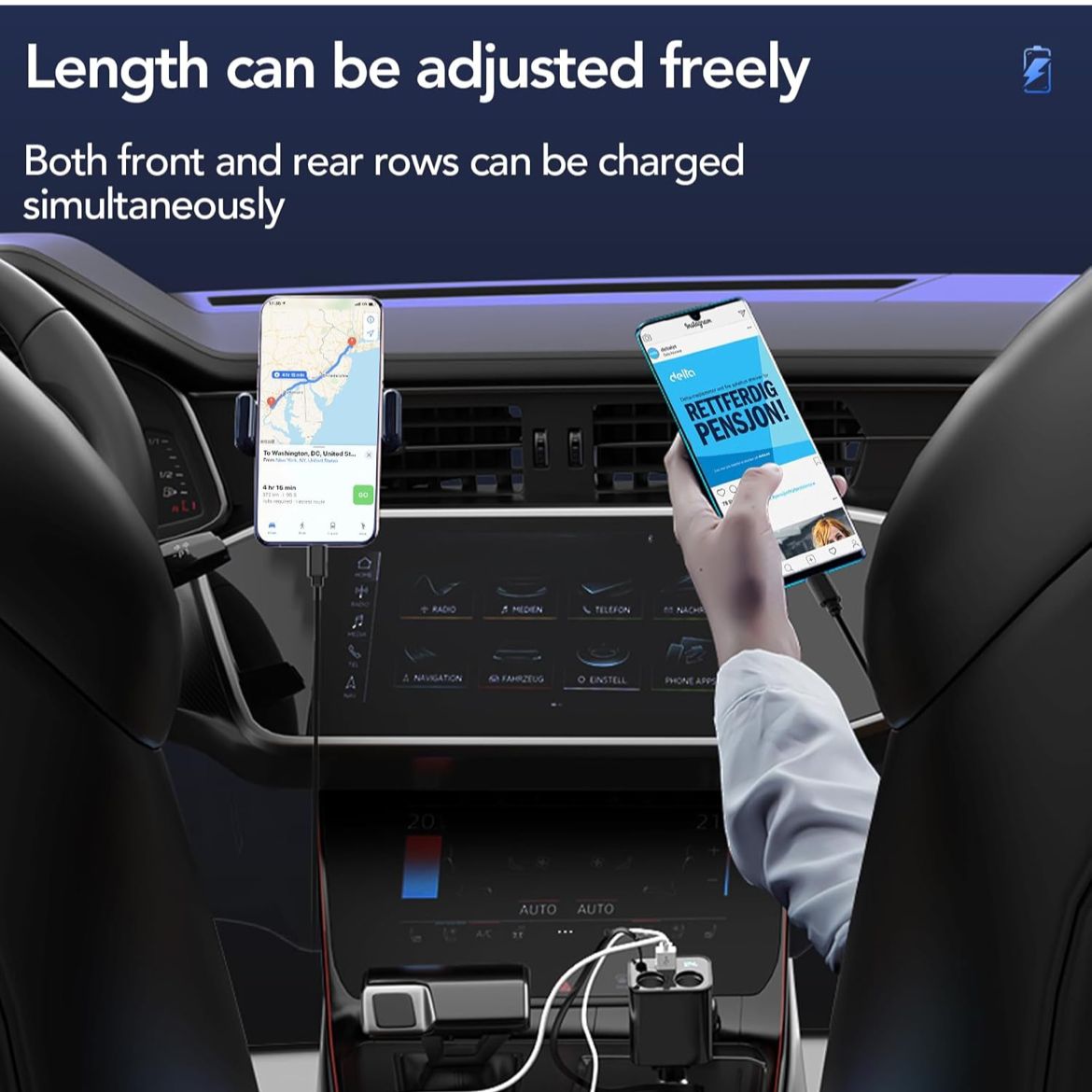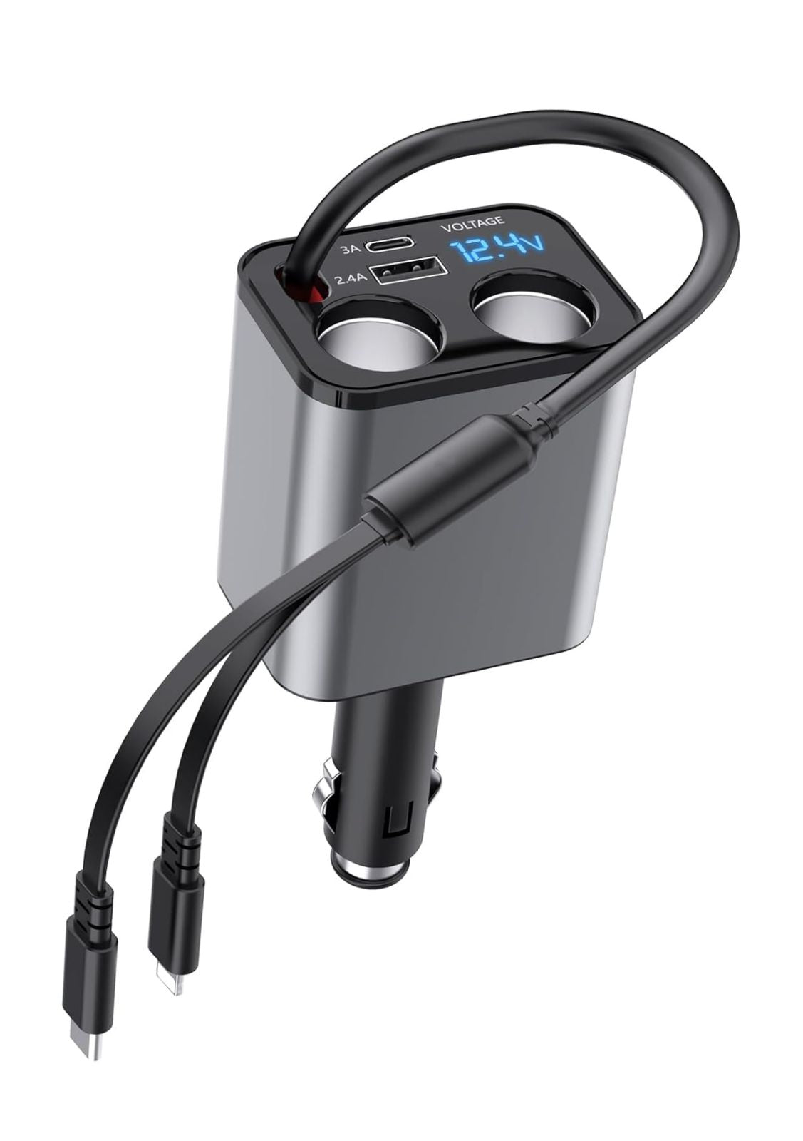 شاحن سيارة قابل للسحب 4 في 1، متوافق مع iPhone 16، شاحن سريع بمنفذ Type-C، قدرة 159 واط مع موزع منفذين ولاعة سجائر – متوافق مع iPhone 16/15/14/13/12 وجالاكسي/بيكسل
