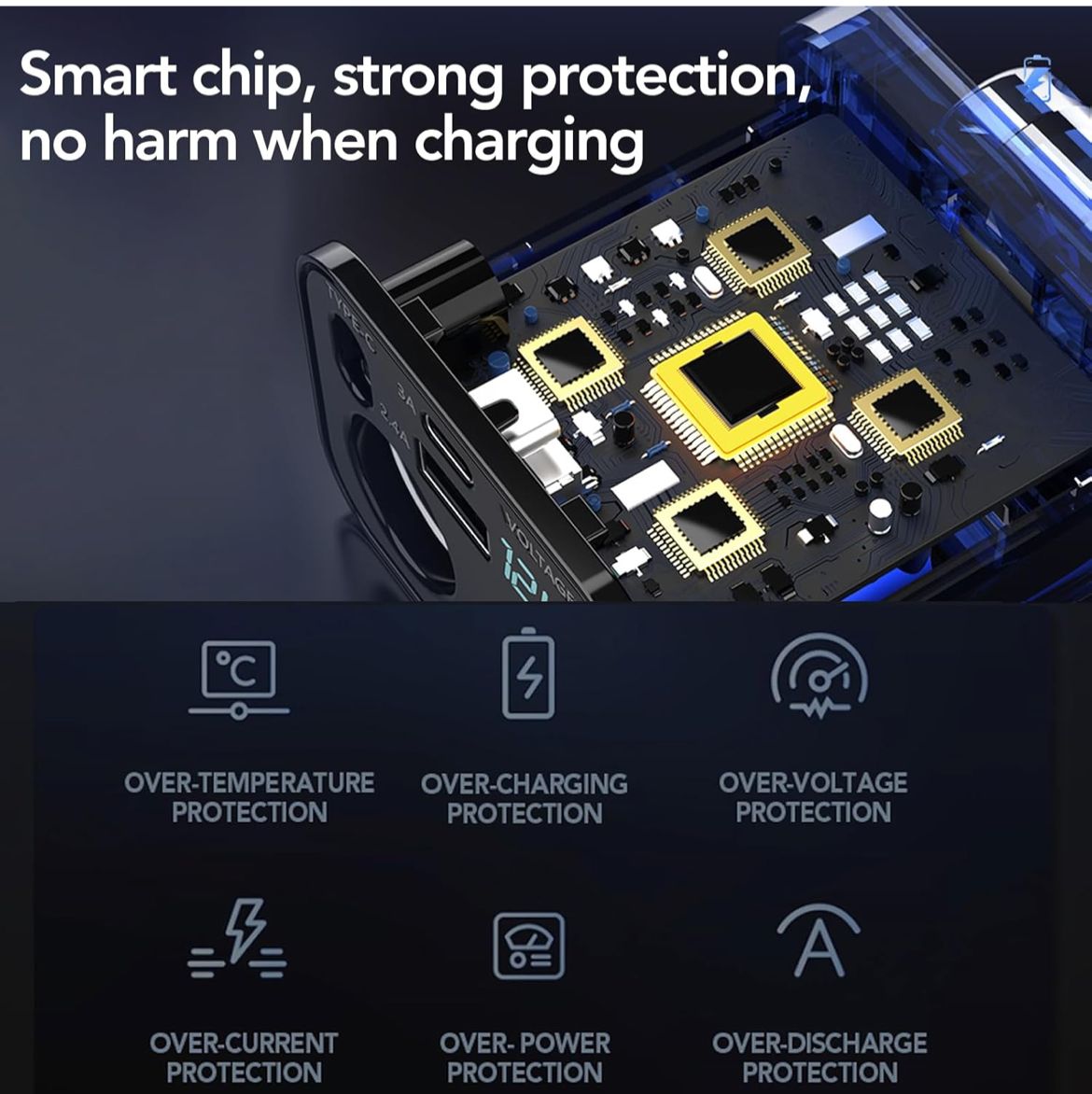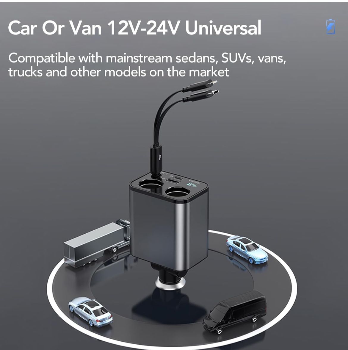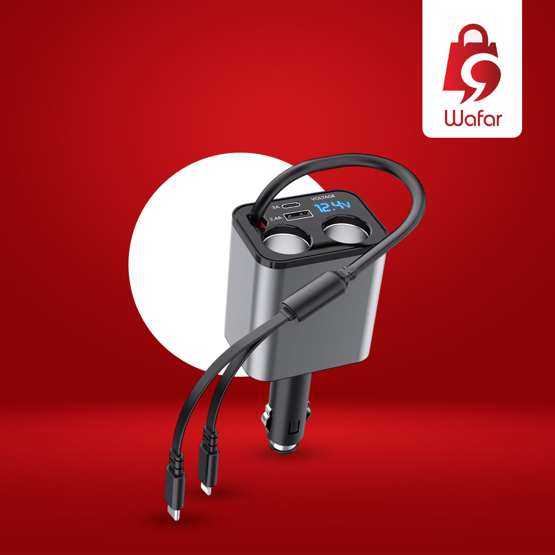 شاحن سيارة قابل للسحب 4 في 1، متوافق مع iPhone 16، شاحن سريع بمنفذ Type-C، قدرة 159 واط مع موزع منفذين ولاعة سجائر – متوافق مع iPhone 16/15/14/13/12 وجالاكسي/بيكسل