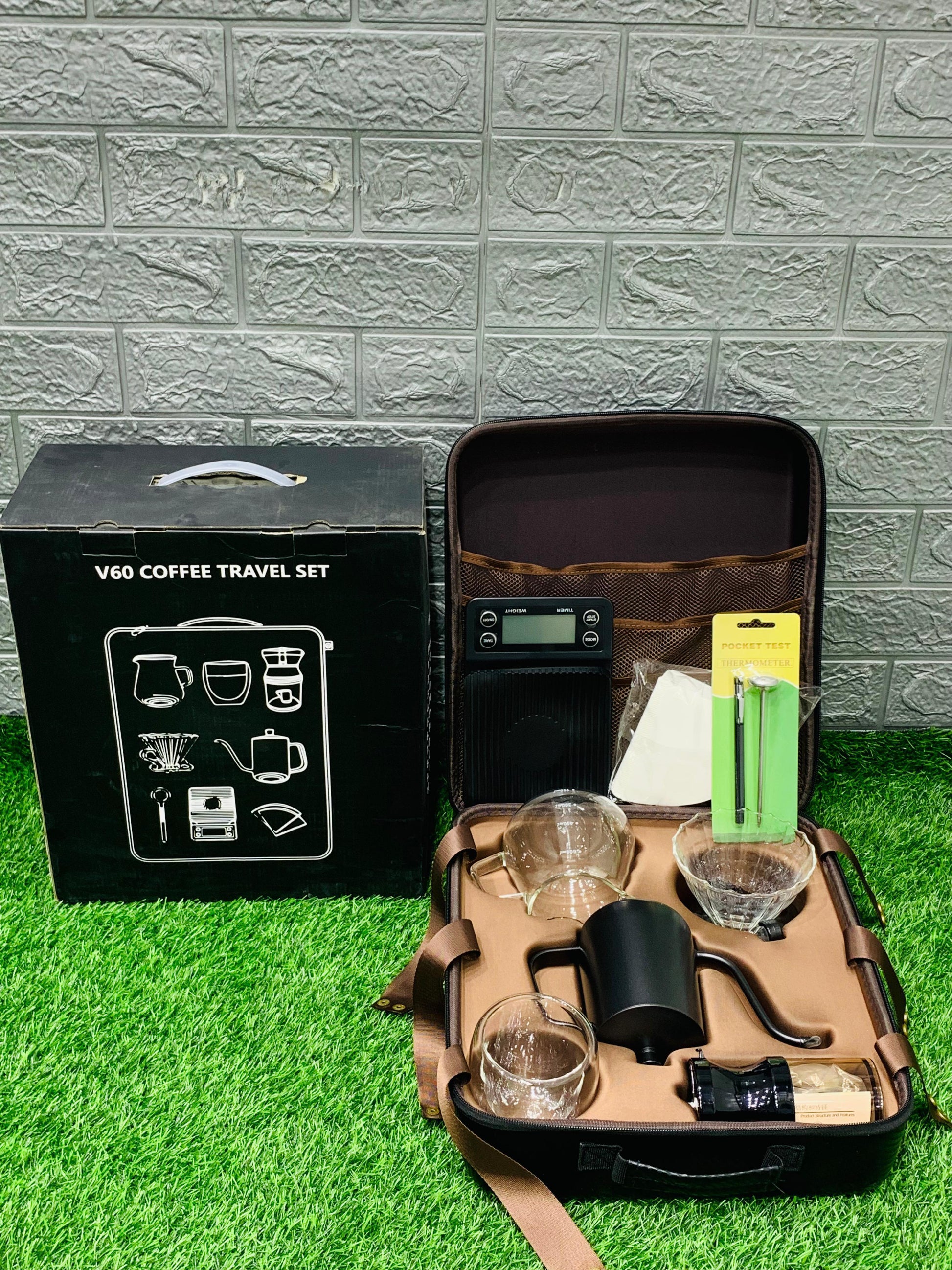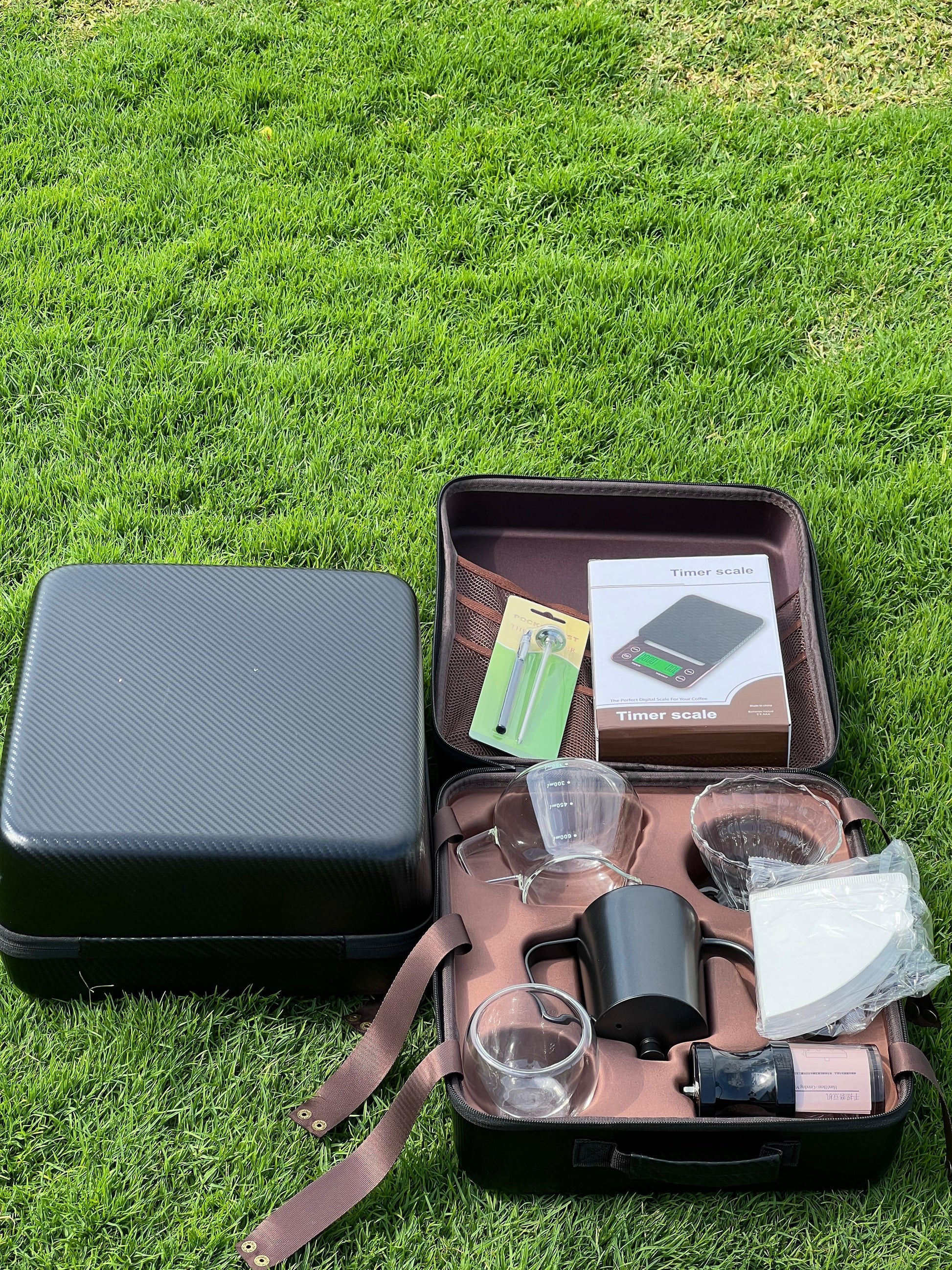 احصل على طقم القهوة المختصة الكامل مع حقيبة أنيقة، يشمل مطحنة وإبريق ترشيح وسيرفر وقمع V60. مثالي لعشاق القهوة في السفر والمنزل.