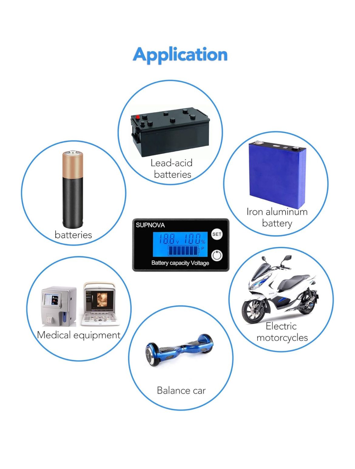شاشة مراقبة البطارية الرقمية من SUPNOVA مناسبة للبطاريات من نوع ليثيوم ثلاثي، حمض الرصاص، وليثيوم فوسفات الحديد بجهد يتراوح بين 8 إلى 100 فولت (تشمل: 12V، 24V، 36V، 48V، 60V، 72V، 84V).