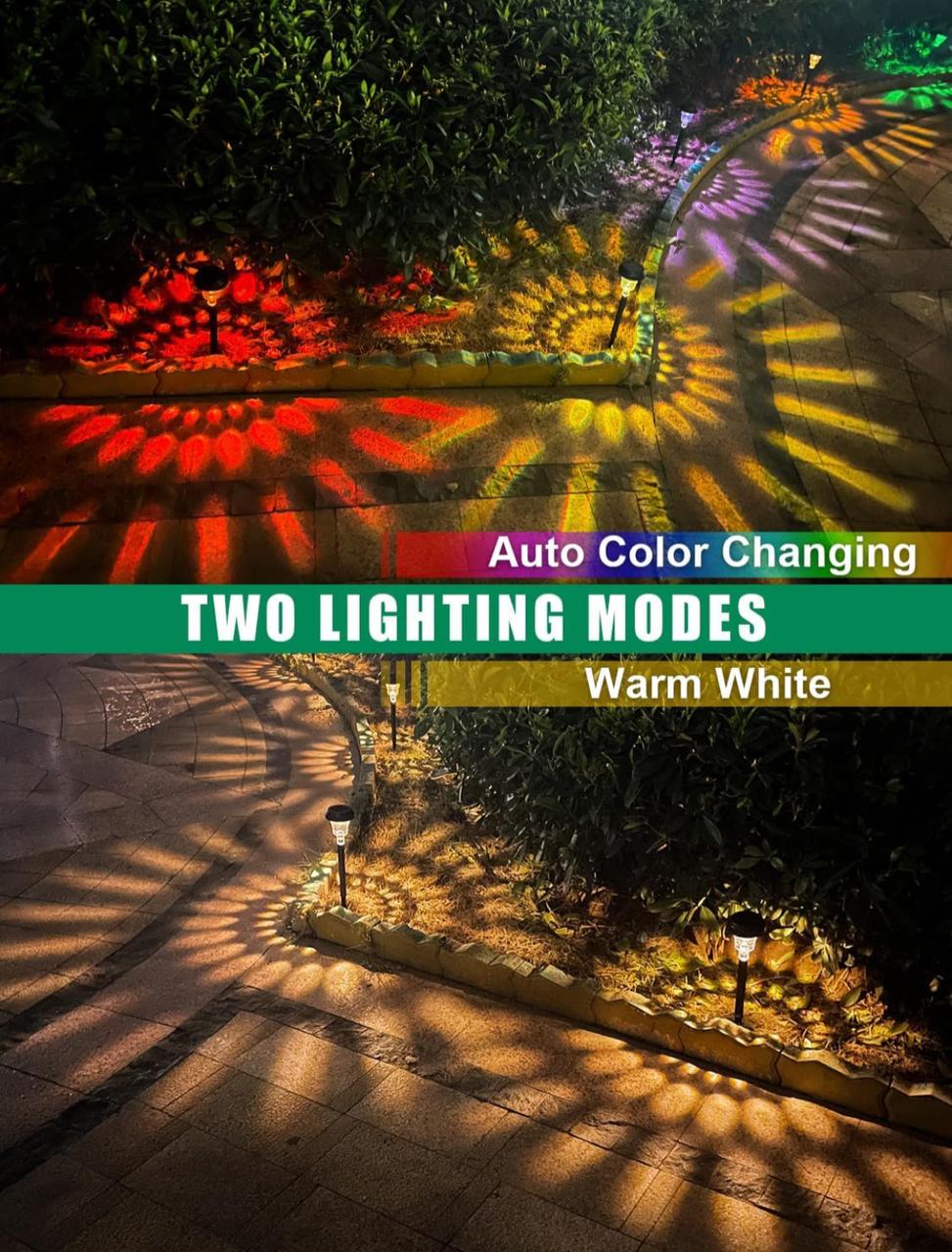 بالمقارنة مع الإضاءة الشمسية التقليدية ذات اللون الأبيض الدافئ فقط، قمنا بترقية مصابيح LED عالية الجودة. يمكن اختيار بين وضعين: الأبيض الدافئ الرقيق أو الألوان المتعددة لتناسب مختلف المناسبات والمشاهد، مما يضفي أنماطًا ضوئية جميلة على الحديقة أو المسار أو العشب.